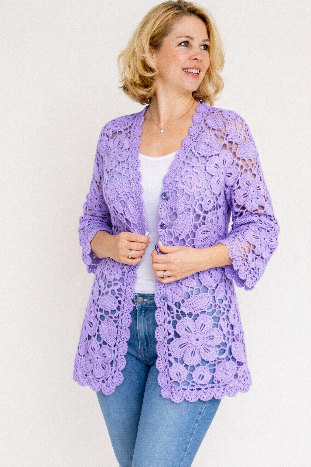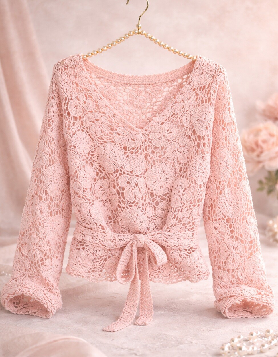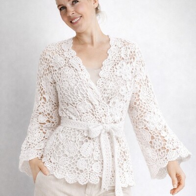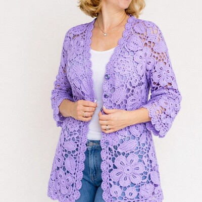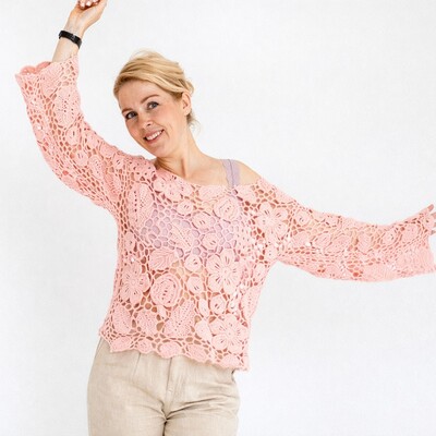 Легкий, женственный джемпер, собранный из изящных мотивов.