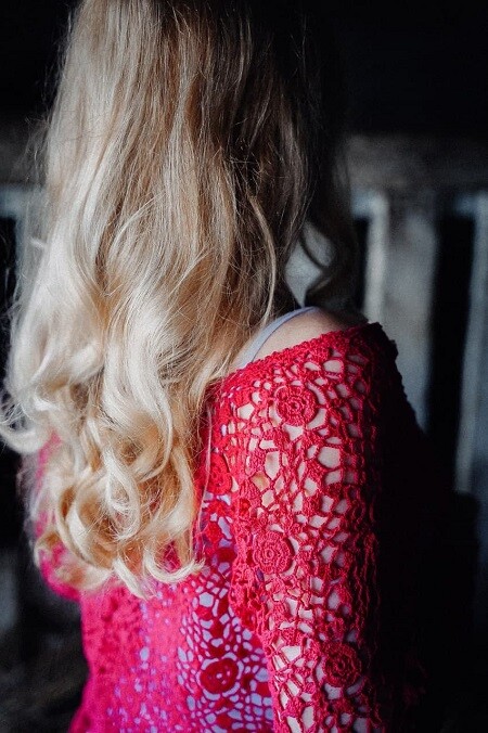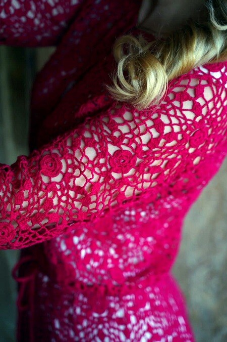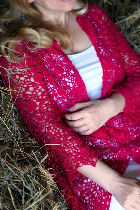 Ответ: Данный кардиган вяжется единым полотном. Мотивы ввязываются один к другому. Не следует путать со сцепным кружевом, в котором мотивы вяжутся отдельно, затем раскладываются на выкройку, а затем сшиваются швейной иглой. В данном изделии мотивы вяжутся поочередно и сразу же ввязываются в полотно.